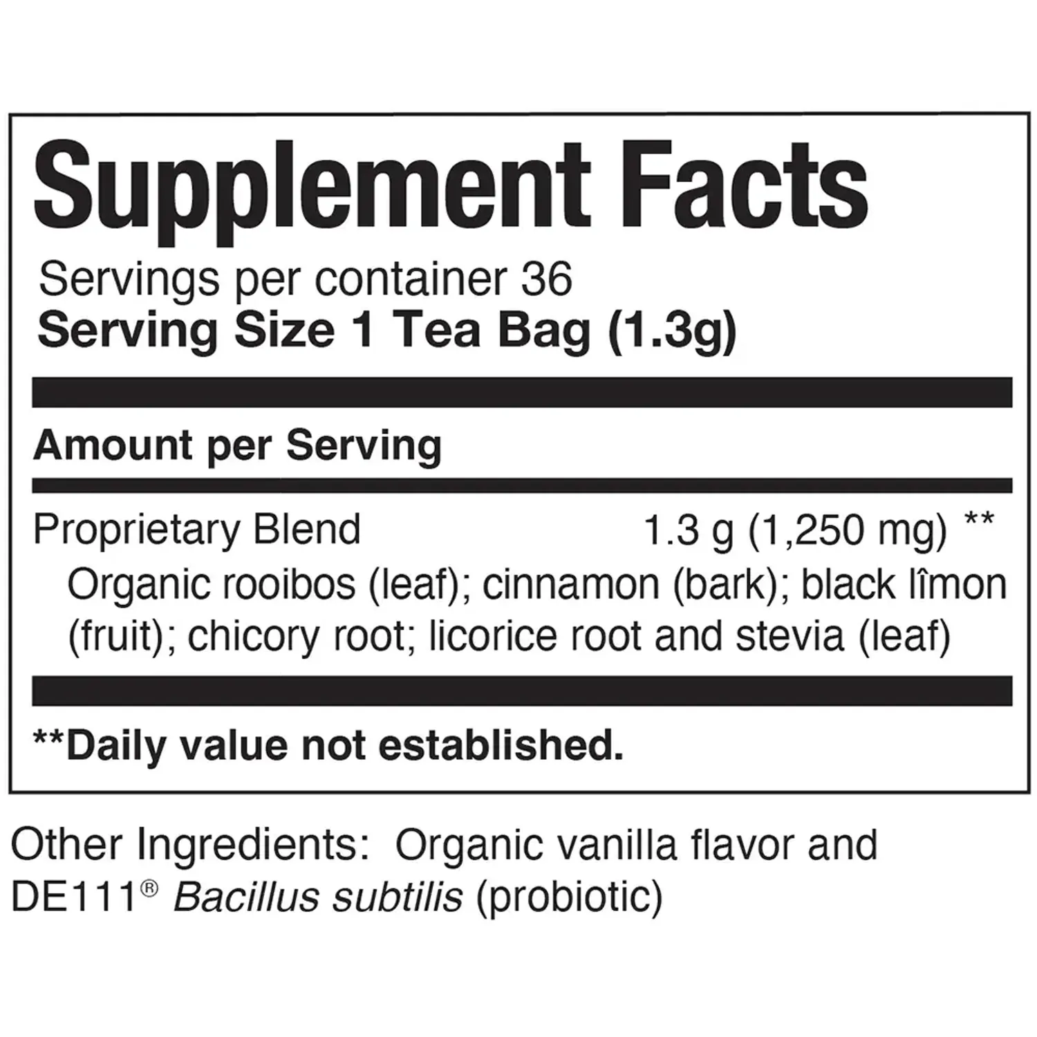 Орц: Organic rooibos (leaf), cinnamon (bark), black limon (fruit), chicory root, licorice root, stevia (leaf), organic vanilla flavor and DE111® Bacillus subtilis (probiotic)